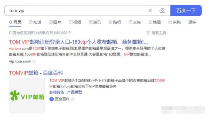 1、首先打开浏览器,搜索Tom vip,点击进入邮箱官网。