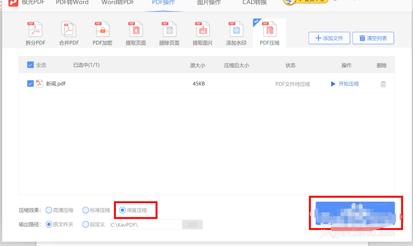 3、添加文件之后,在下方“压缩效果”点击“深度压缩”。检查界面信息是否有误,无误后我们选择“开始压缩”。