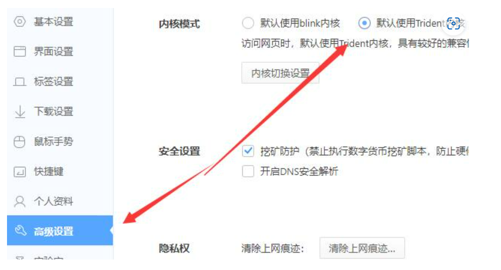2、左侧栏切换到“高级设置”,然后将内核模式勾选为“默认使用Trident内核”就可以了。
