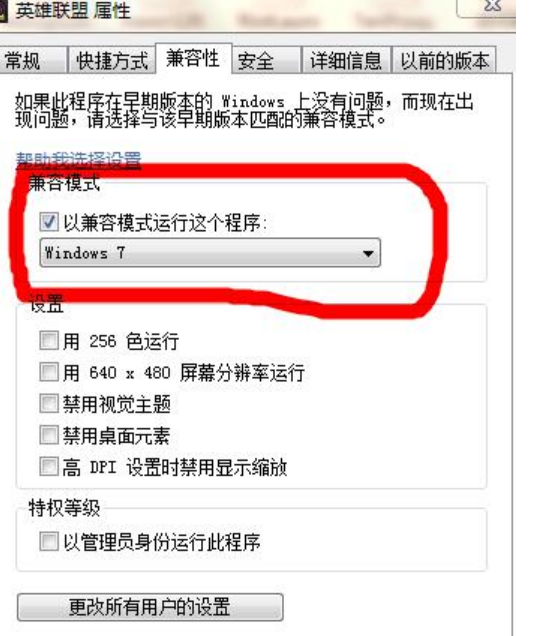2、在lol游戏上右击,打开属性,切换到“兼容性”选项,并勾选“以兼容模式运行这个程序”。