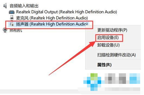 3、鼠标右键点击扬声器,点击启用设备。
