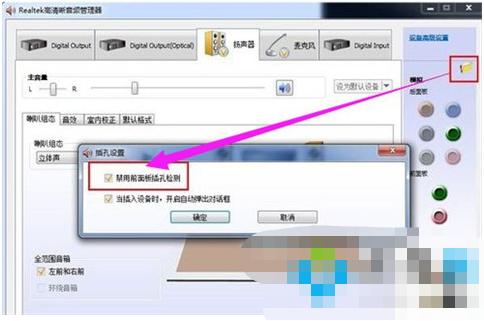 1、首先打开音频管理器,点击右边插孔设置,勾选禁用前面板插孔检测,鼠标点击确定。