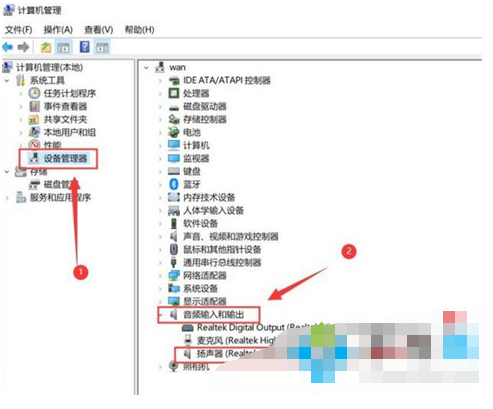 2、点击红色箭头一处的设备管理器,顺着找到音频输入以及输出;