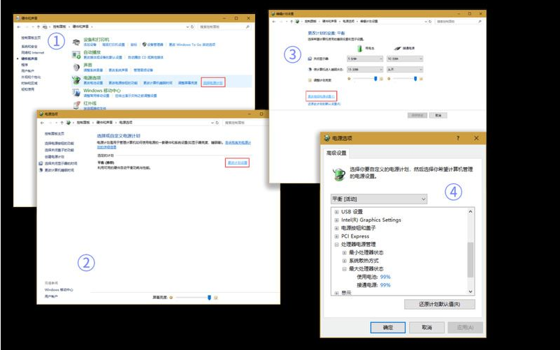 2.点击进入控制面板-选择电源选项-选择默认选择的计划-更改计划设置-更改高级电源设置-处理器电源管理-最大处理器状态,接着将两项数值均调整到 99%,99% 即不开启 Turbo Boost(实际上处理器还是几乎能跑到额定的最大功率)。