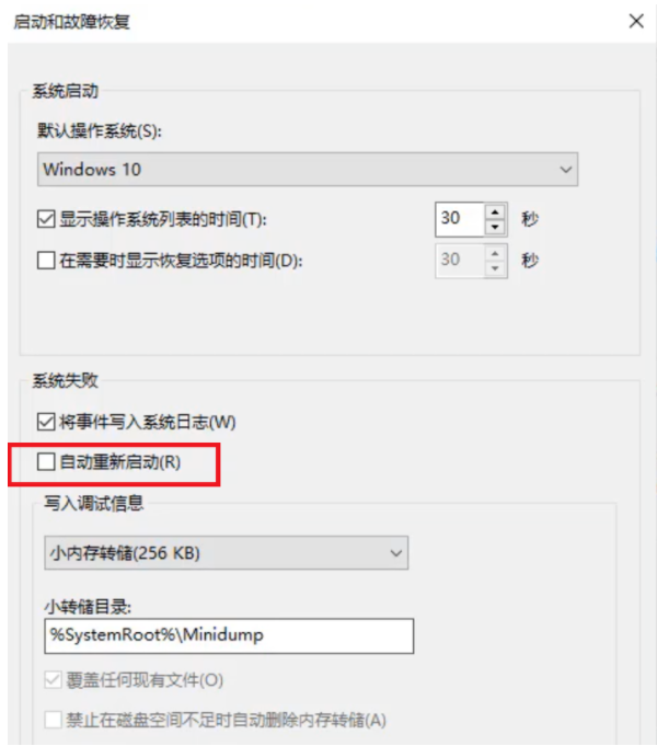 9、进入窗口界面之后,点击【系统失败】一栏,取消勾选【自动重新启动】,点击确定。