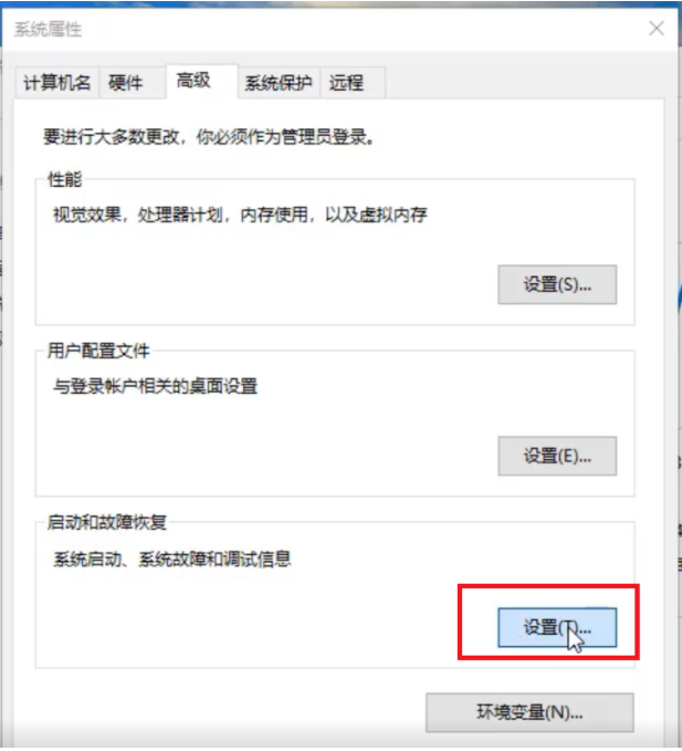 8、出现系统属性弹窗界面,切换【高级】,选择【启动和故障恢复】,点击【设置】即可。