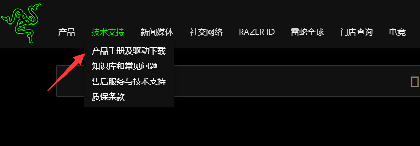 1、先在电脑浏览器上搜索雷蛇鼠标官网点击进入,选择上方的技术支持,找到产品手册及驱动下载进入。