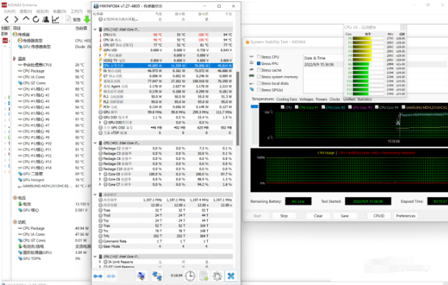 4.在高能模式之下,在AIDA6的15分钟烤机测试后,CPU平均温度为94°C,此时CPU的功耗释放仍然高达近50W,但频率明显下降,P核心为2.8GHz,E核心为2.4GHz,总体来说性能释放水平蛮不错的。