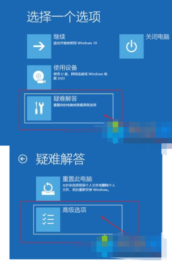 1、开机或重启电脑,在Windows 启动之前,按重启或电源按钮连续强制重启 3 次,进入选择选项界面,点击“疑难解答”,点击“高级选项”即可。