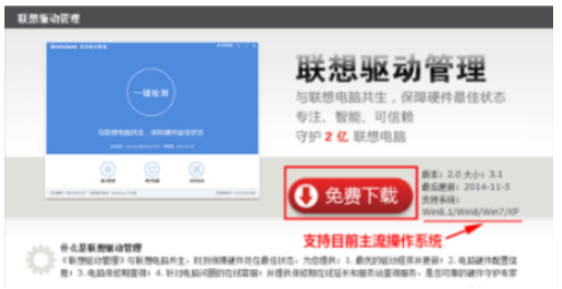2. 点击界面上的“免费下载”。说明一下,联想驱动管理支持目前主流的 Windows 操作系统,从 XP 和 8.1 全包含在内。