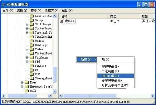 4、创建成功之后打开StorageDevicePolicies,在空白处单击右键,然后点击新建-DWORD值,命名为WriteProtect。