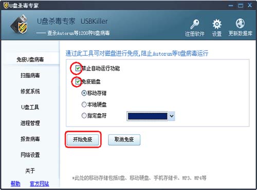 2、在项目栏上单击“免疫U盘病毒”选项。选中“禁止自动运行功能”和“免疫磁盘”,根据需要进行磁盘的选择,单击“开始免疫”,既可做到U盘病毒的免疫作用。