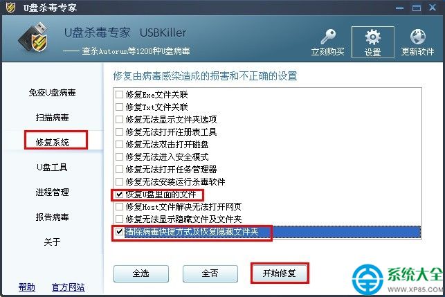 我们还可以手动恢复U盘文件数据,点击“修复系统”,勾上“恢复U盘里面的文件”和“清除病毒快捷方式及恢复隐藏文件夹选项” 两个选项,点击“开始修复”,便可达到U盘文件数据恢复工具的效果。