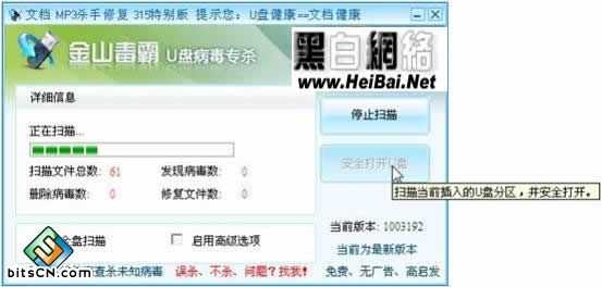 金山U盘病毒专杀在安全打开U盘的同时会建议用户使用金山急救箱查杀未知病毒,如图所示。