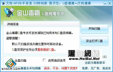 金山U盘病毒专杀可启发清除已知和未知的U盘病毒,用户只需点击界面右侧的“开始扫描”按钮即可运行扫描程序,如图所示。