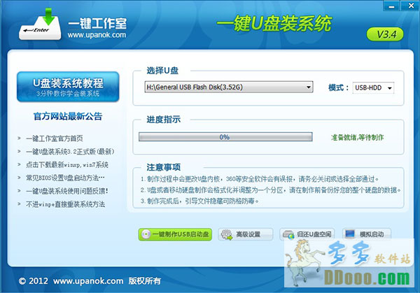 3、安装一键U盘装系统软件,开始制作启动盘,画面如下图,插入u盘,点击“一键制作usb启动盘”按钮后便开始为你制作启动盘。