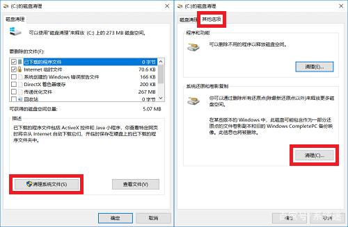 3、不过,大家可能没注意到,磁盘清理旁边还有一个“其他选项”,我们可以在里面清理“系统还原和卷影复制”,我们点“清理”,再选择“删除”即可。