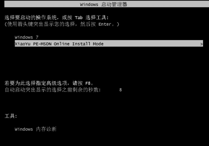 4.重启后出现启动项管理器,选择第二个进入小鱼pe系统。