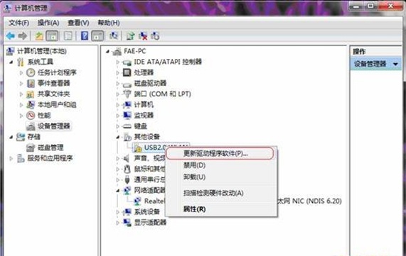 1、在出现黄色叹号的USB驱动上右键点击,然后选择“更新驱动程序软件”,如上图所示: