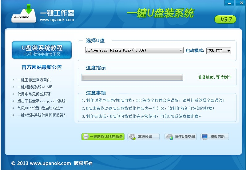 一键u盘装系统V3.7版软件版本:V3.7版软件大小:331MB运行环境:Windows系统下载数量:10004次软件语言:简体中文发布日期:2014-03-26