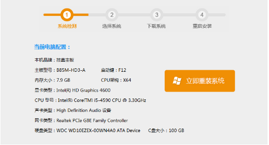 2、自动显示当前电脑配置,点击“立即重装系统”;