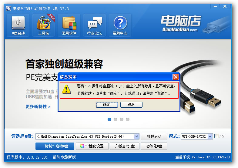 2、插入U盘之后程序会提示是否继续,确认所选U盘无重要数据后开始制作: