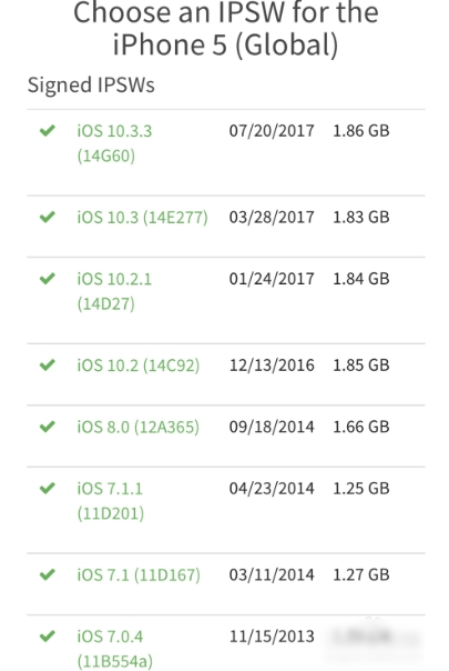 经过实际查询后可以清楚的看到,iPhone 5、5S、6、6S、7系列机型的老版本固件,苹果都已经默认开启了降级通道,所以如果你愿意可以退回原来系统,告别被限制性能的窘境,iPhone 5可以降到iOS 6.1.3,、iPhone 5S可以降到iOS 7.0.3、iPhone 6、6S、7都可以降到iOS 10.2,如下图所示: