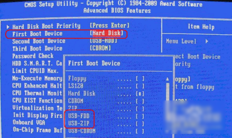 然后,有了系统文件和可启动电脑的U盘,然后再设置电脑从U盘启动。按DEL进入BIOS,将里面的“First Boot Device”选择为“USB-ZIP”。
