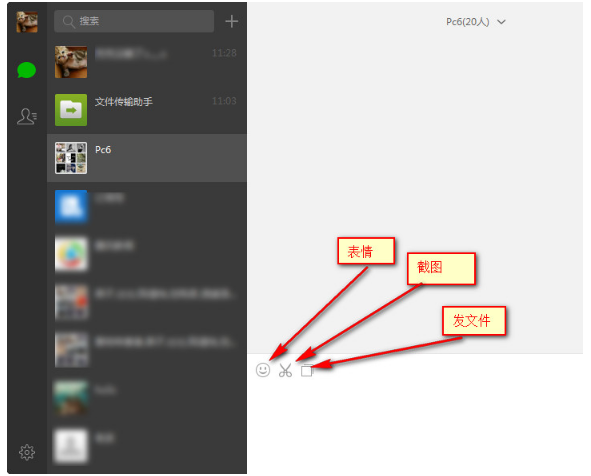 进入主页面,我们可以看到在左侧有你头像下面是你的最近联系人,点击你的最近联系人,我们可以看到右侧会出现对话框,对话框中有三个按钮分别是“表情”“截图”和“发文件”