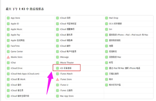 找到系统状态页面上的列表。如果“iOS 设备激活”旁的方框不是绿色,请尝试稍后再激活您的 iPhone。