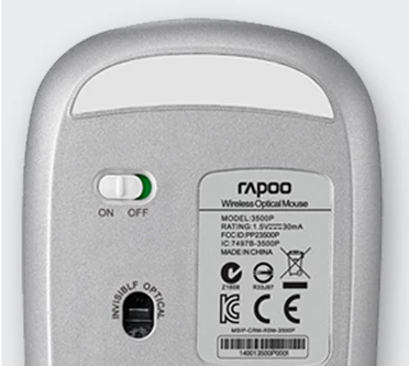 2、将鼠标翻过来,查看无线鼠标开关是否开启,同时检查电池仓中的电池是否安装正确,可更换新电池。因为电量不足会导致无线鼠标操作缓慢,甚至无反应的情况发生。