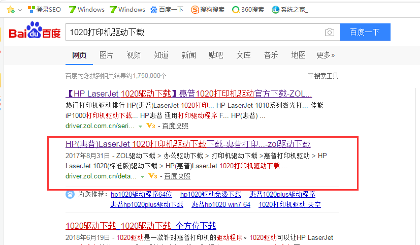 1,进入百度之后,属入‘’1020打印机驱动下载‘’,接接下来如图操作: