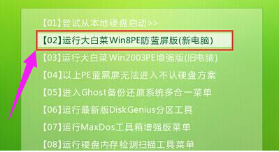 首先将大白菜U盘启动盘插入USB接口,然后重启电脑,待开机画面出现时,通过使用快捷键引导U盘进入大白菜主菜单,移动↓键选择“【02】运行大白菜Win8PE防蓝屏版(新电脑)”回车确认。