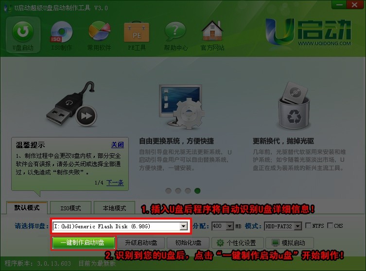 回答:继续上面的操作,我们现在插入需要制作启动盘的U盘,U启动将会自动识别U盘详细信息,如下图: