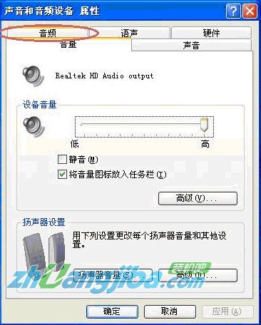 2. 在打开的声音和音频设备属性里面,点击选项卡“音频”;