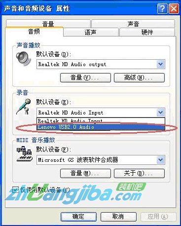 在音频选项卡里面,选择录音默认设备里面的 Lenovo USB2.0 Audio ,之后点击确定。