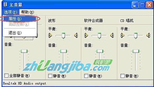 4. 在打开的主音量窗口里面,点击选项,选择里面的“属性”;
