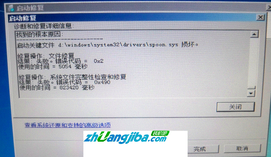 使用Windows 7操作系统开机提示自动修复,无法正常进入操作系统。经过分析,部分系统修复报错文件为:X:Windows\system32\drivers\spoon.sys 如下图: