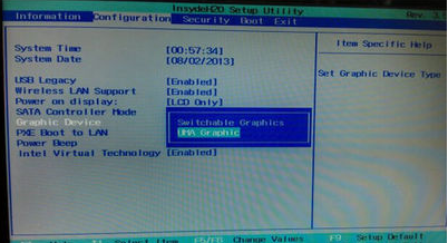 1、一般开机的时候按 F2 或 F12 或者 Esc、Del 等进入 Bios,在 Bios 选项中找到 Configuration(配置)选项,然后再找到 Graphic Device(显卡设备)进行选择,设置后按 F10 保存即可。