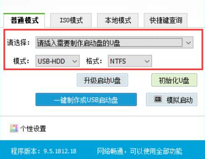 3、选择普通模式选项卡,“请选择”中选择自身U盘设备名称。模式选择USB—HDD,格式选择“NTFS”