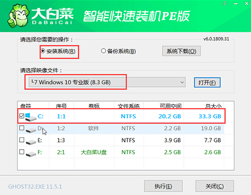 3、我们用鼠标双击打开装机软件,选择win10映像文件,勾选“C盘”,点击执行。