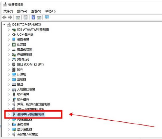 2:进入设备管理器窗口,找到并点击“通用串行总线控制器”。