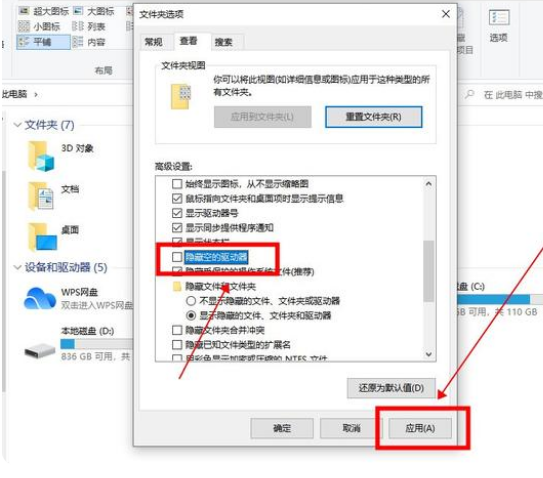 3:在下方的高级设置中,取消勾选“隐藏空的驱动器”,点击“应用”即可。