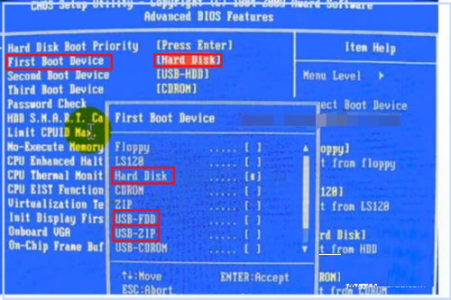 返回上一次界面,点击第一个启动设备First Boot Device,选Hard Disk就行了。