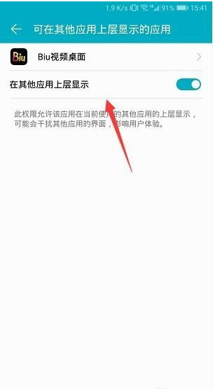 3、 点击打开透明皮肤,需要在手机里设置允许这个软件显示在应用最上层,点击 去设置,然后开启 在其他应用上层显示,如下图