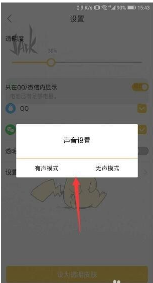 3、 点击打开透明皮肤,需要在手机里设置允许这个软件显示在应用最上层,点击 去设置,然后开启 在其他应用上层显示。