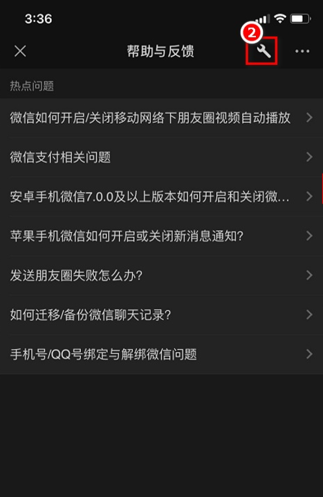 2、进入帮助与反馈的界面后,顶部有一个小工具的图标,点击进入。