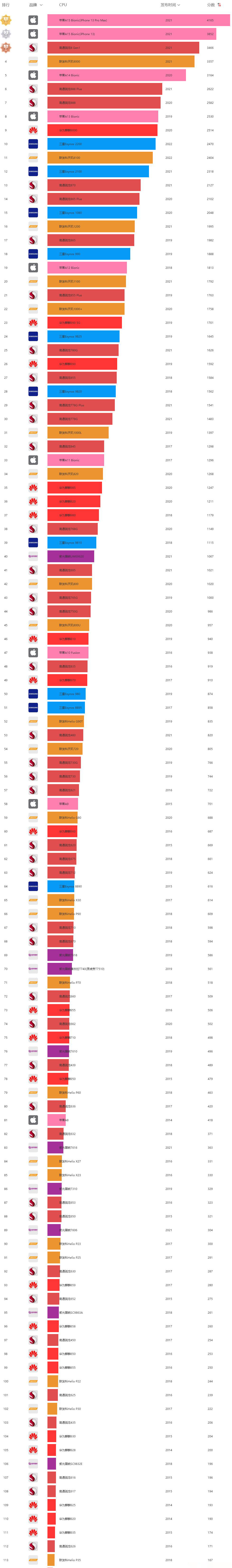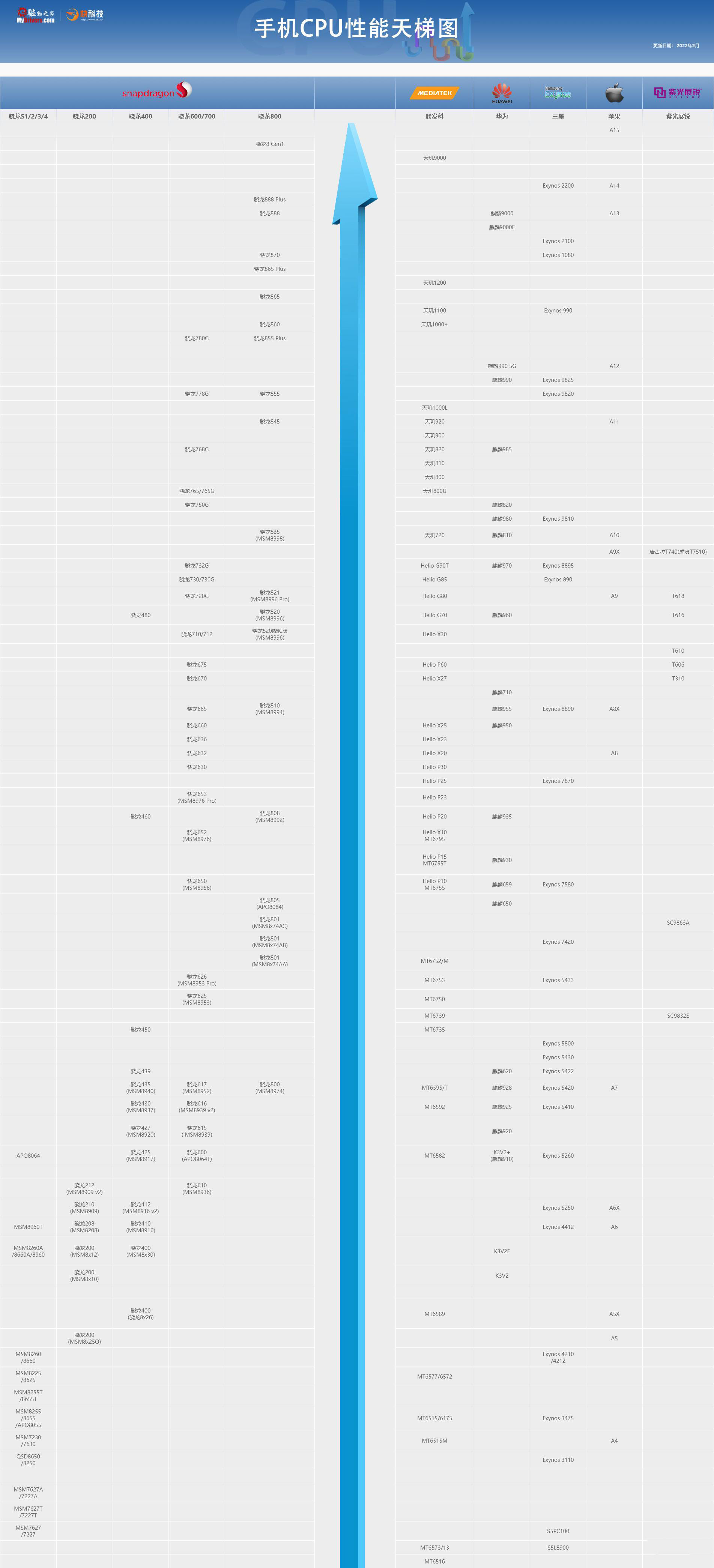 2022最新手机cpu(soc)性能排行榜如下图所示(图片是高清大图,页面显示的是缩放状态,需要保存到本地电脑查看,或者在浏览器新标签页打开查看大图)