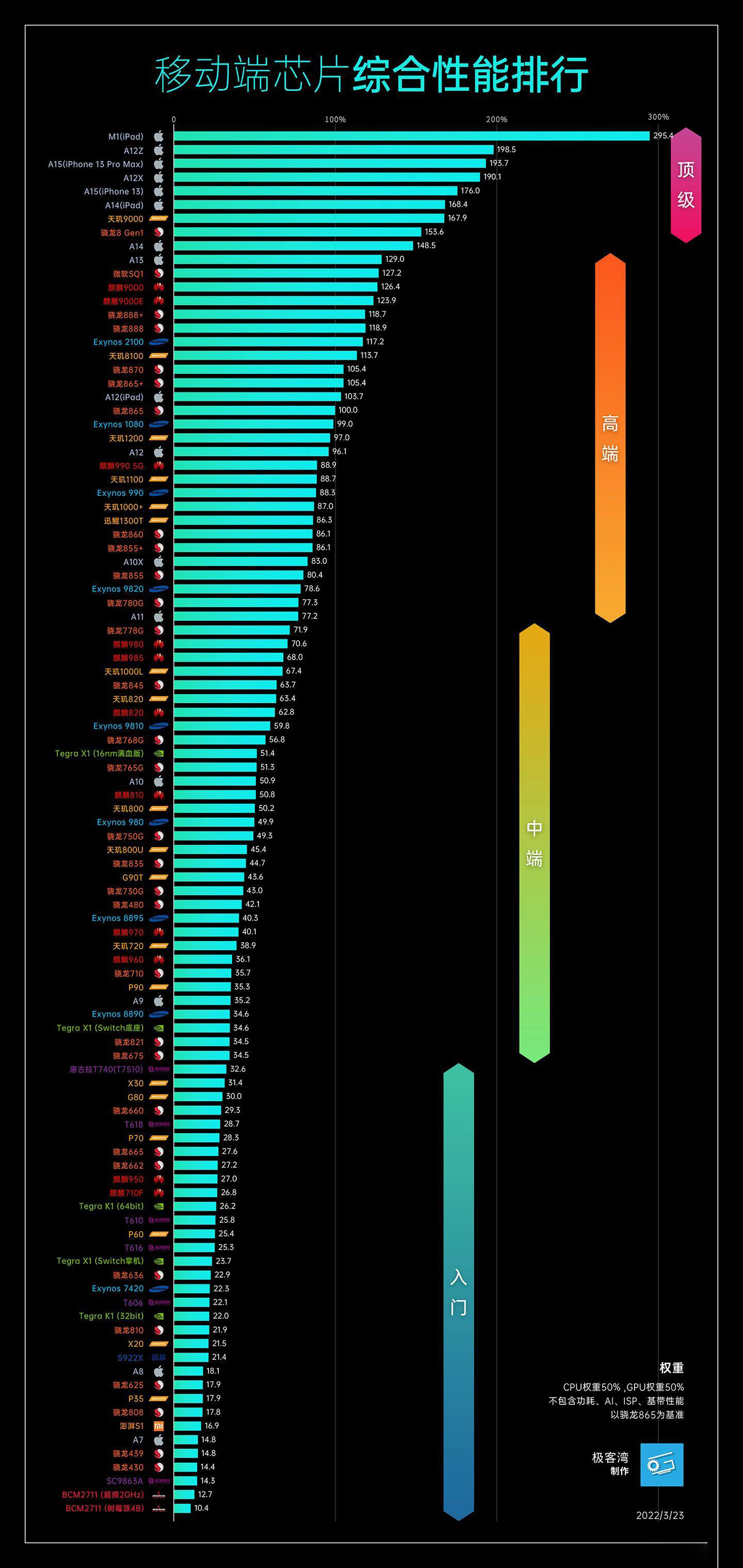 下面这个处理器性能排行榜2022手机版本由极客湾制作,包含苹果芯片和安卓芯片,以骁龙865为基准,CPU权重50%,GPU权重50%(手机芯片由cpu和gpu组成)。同时对比苹果芯片、高通骁龙芯片、华为海思麒麟芯片,三星猎户座芯片,联发科天玑芯片等。