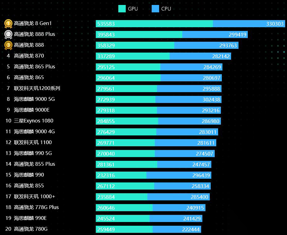 下面这个最新手机芯片soc跑分排行榜,由鲁大师于近日发布,数据来源于2021年所有主流安卓手机芯片跑分,Android手机芯片跑分由两部分组成即cpu跑分和gpu跑分。从榜单可以看到最强的安卓手机芯片是高通骁龙8 Gen1,其次是高通骁龙888 Plus,高通骁龙888等。